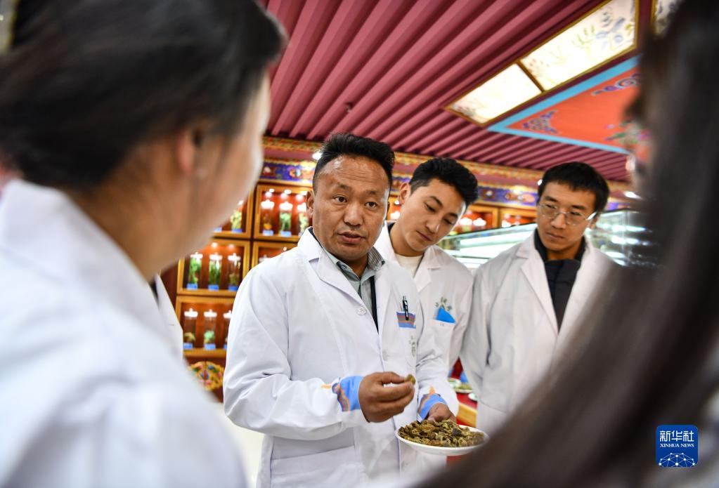 在藏藥材標(biāo)本室,普窮次仁為學(xué)生們講解藏藥材知識(4月20日攝)。新華社記者 晉美多吉 攝