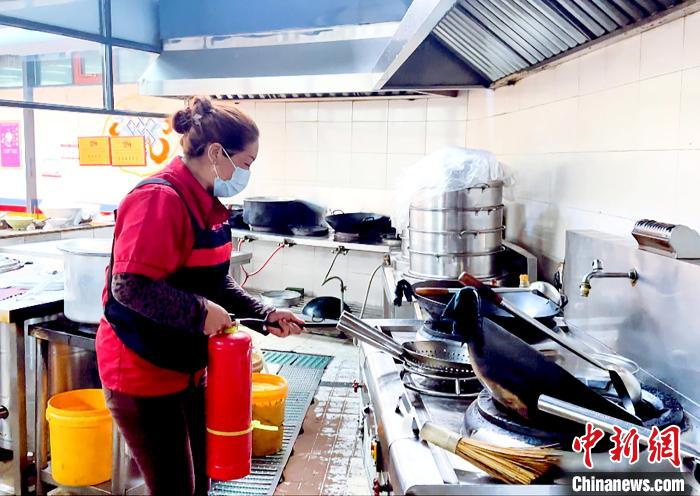 模擬廚房發(fā)生火災(zāi),員工發(fā)現(xiàn)火源后,立即關(guān)閉燃氣閥,拉閘斷電,第一時間利用周邊滅火器進行初期火災(zāi)撲救。 劉瑜 攝