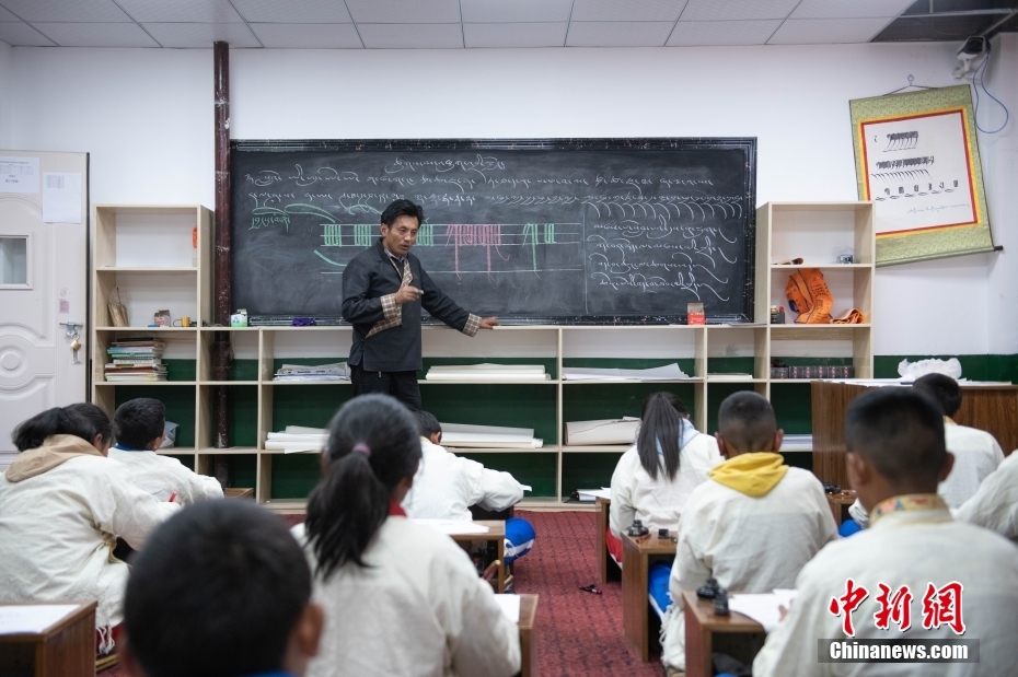 5月7日,西藏山南市,加查縣中學(xué)藏文書法興趣班的教師扎西達(dá)瓦給學(xué)生們上課。該興趣班由2名藏文教師任教,每周兩課時(shí),利用自習(xí)課或晚自習(xí)時(shí)間為學(xué)生和教師授課。課程內(nèi)容包含執(zhí)筆、運(yùn)筆、姿勢(shì)等基礎(chǔ)書寫技能,以及藏文中的烏金體、珠擦體、簇仁體、簇通體等各類字體的書寫方法。