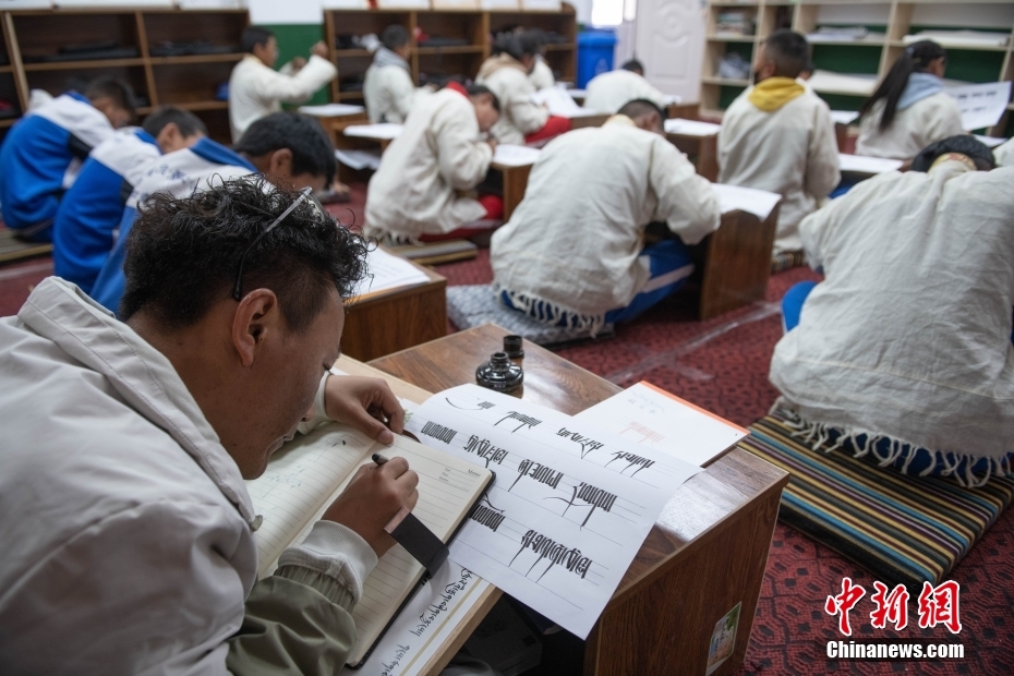 5月7日,西藏山南市,加查縣中學(xué)學(xué)生和教師在上藏文書法興趣班。該興趣班由2名藏文教師任教,每周兩課時(shí),利用自習(xí)課或晚自習(xí)時(shí)間為學(xué)生和教師授課。課程內(nèi)容包含執(zhí)筆、運(yùn)筆、姿勢(shì)等基礎(chǔ)書寫技能,以及藏文中的烏金體、珠擦體、簇仁體、簇通體等各類字體的書寫方法。