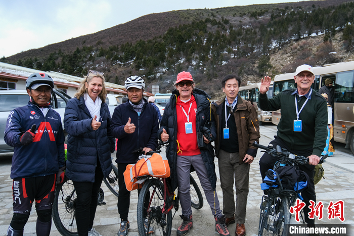 圖為5月17日,參訪團(tuán)成員在林芝魯朗觀景臺(tái)與騎行國(guó)道318線的旅行者合影。 中新社記者 江飛波 攝