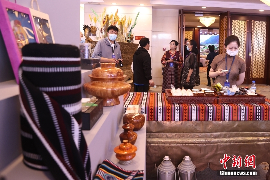 5月23日,“2023·中國(guó)西藏發(fā)展論壇”在北京舉行。會(huì)場(chǎng)外,活潑獨(dú)特的藏式迎賓舞蹈、展示西藏人文自然風(fēng)貌的圖片,已在論壇開幕前預(yù)熱起探討西藏新發(fā)展的氛圍。圖為展臺(tái)上,布置著色彩豐富的藏式布匹、紙藝文創(chuàng)產(chǎn)品、藏香、酥油茶等。