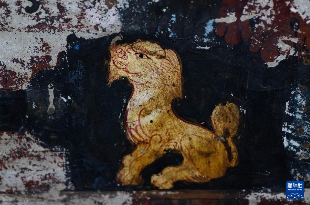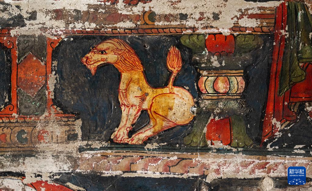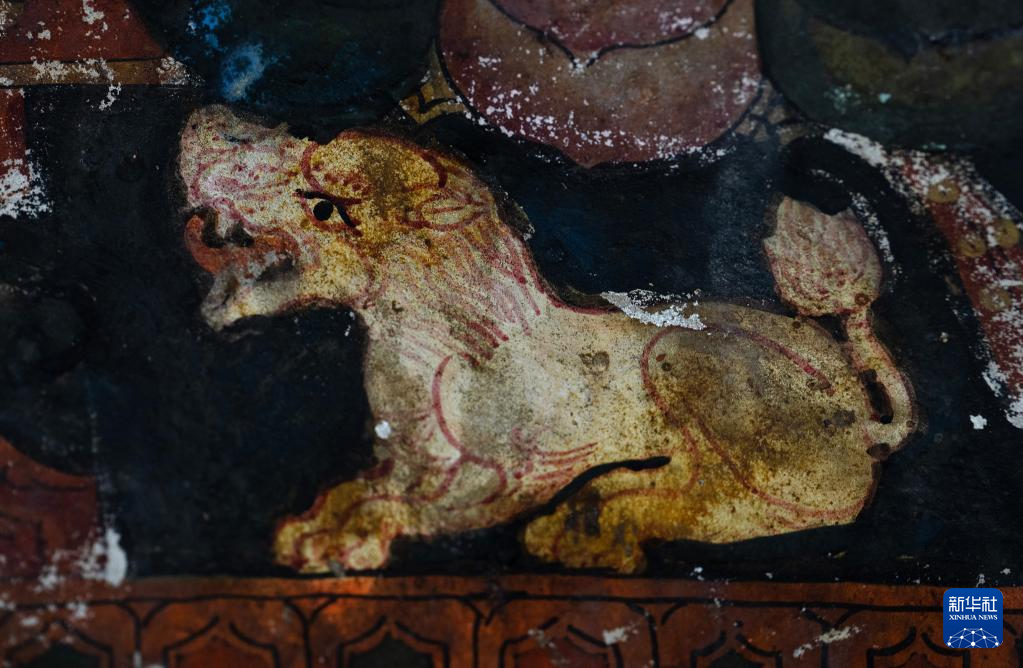 這是5月26日拍攝的皮央石窟壁畫(huà)中的獅子像。新華社記者 費(fèi)茂華 攝