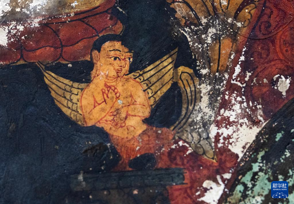 這是5月26日拍攝的皮央石窟壁畫(huà)中的長(zhǎng)翅膀的人物造型。新華社記者 費(fèi)茂華 攝