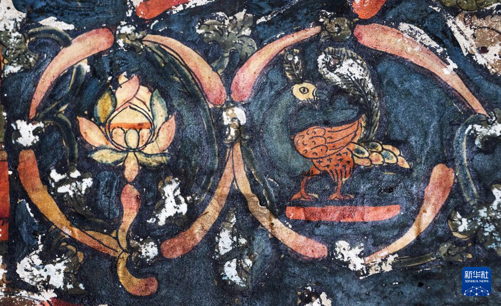 這是5月26日拍攝的皮央石窟壁畫(huà)中的孔雀像。新華社記者 費(fèi)茂華 攝