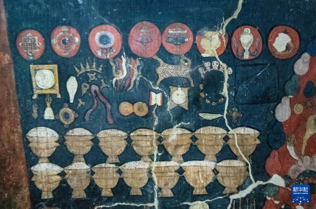 這是5月26日拍攝的皮央石窟壁畫(huà)中的吉祥八寶。新華社記者 晉美多吉 攝