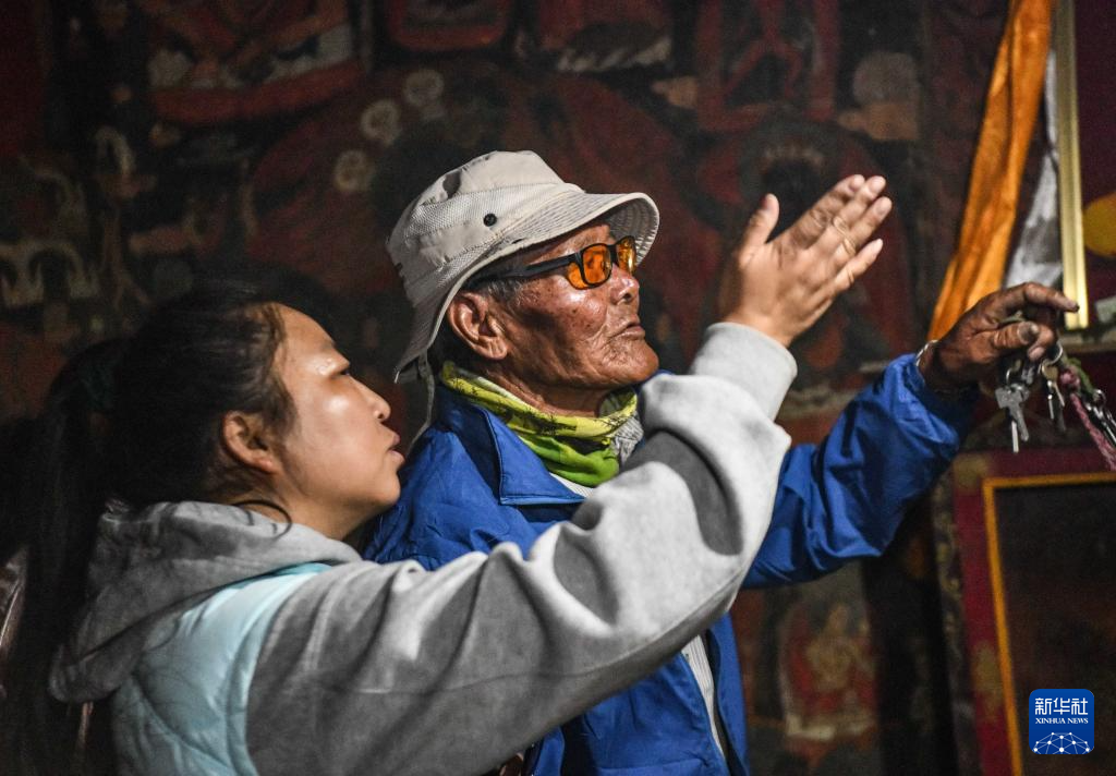 皮央和東嘎石窟遺址文保員仁增旺扎老人給游客講解壁畫(huà)(5月26日攝)。新華社記者 晉美多吉 攝