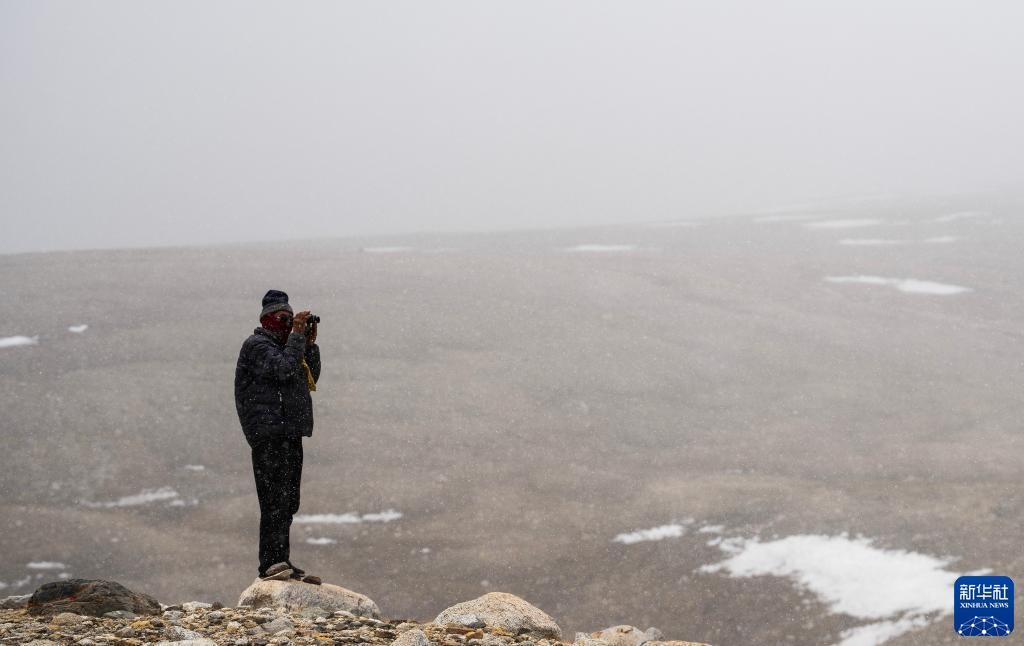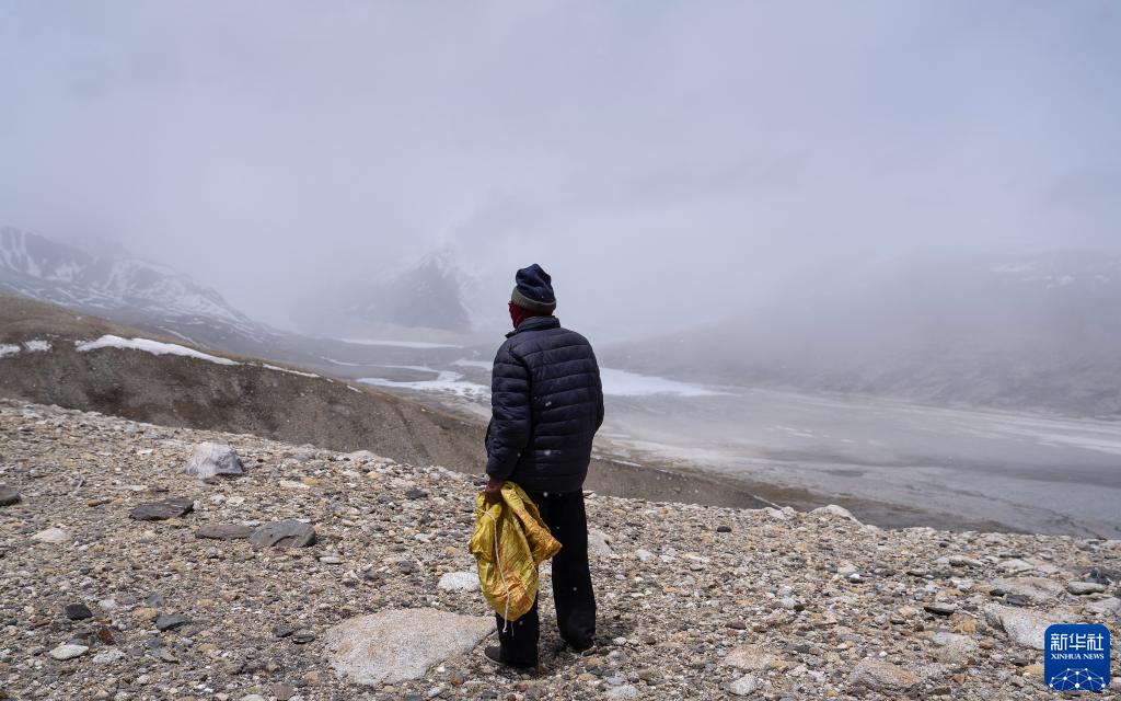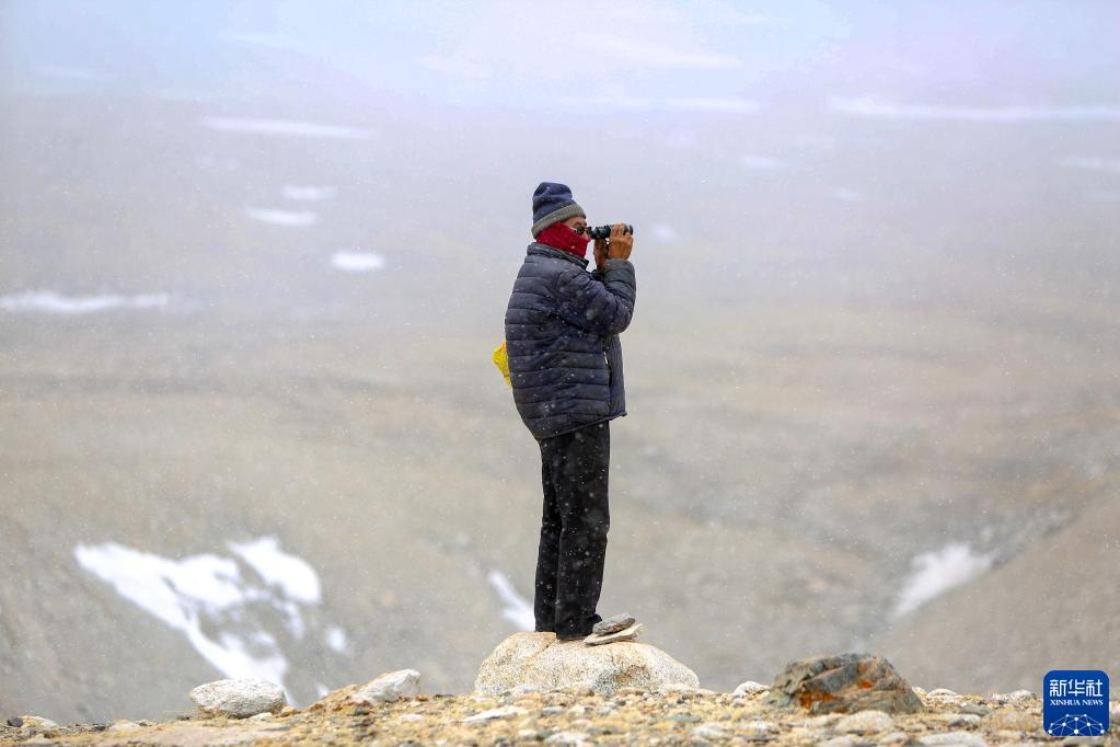 乃乃在用望遠鏡查看冰川是否有異樣(5月31日攝)。新華社記者 晉美多吉 攝