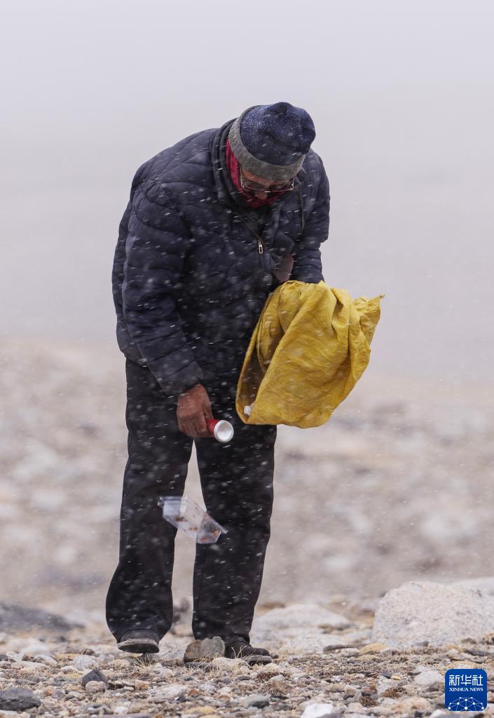 5月31日,乃乃老人在杰瑪央宗冰川附近撿拾垃圾。新華社記者 費茂華 攝