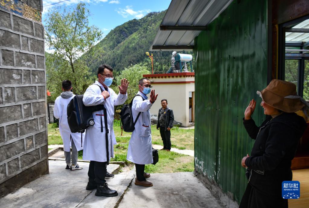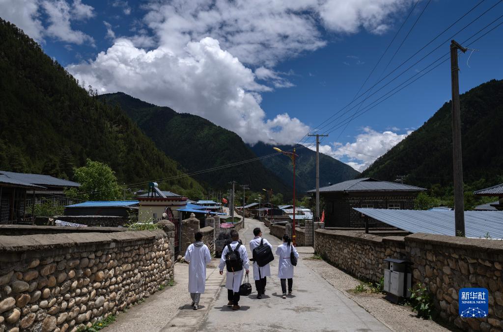 6月12日,入戶診治結(jié)束后,王振疆(左二)、王彤旭(右二)、陳冰(右一)和尼瑪益西走向村委會。新華社記者 費茂華 攝