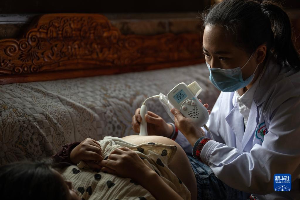 6月12日,陳冰(右)在為懷孕38周的扎西央宗進行產(chǎn)檢。新華社記者 費茂華 攝