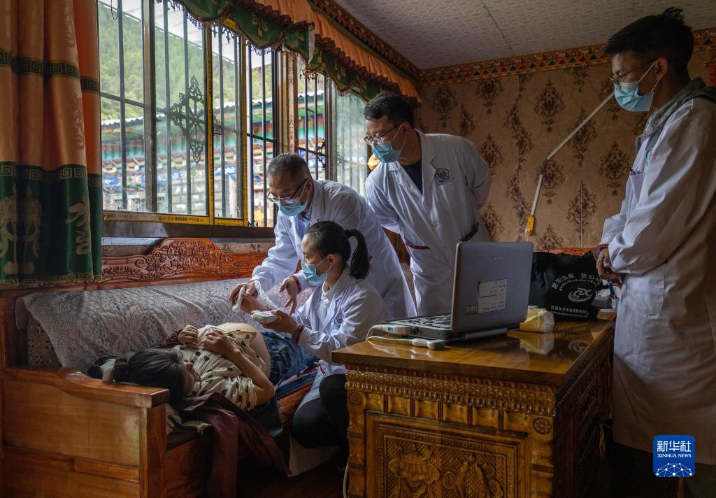6月12日,王振疆(上左)、王彤旭(上中)和尼瑪益西(右一)協(xié)助陳冰(下右)為扎西央宗進行產(chǎn)檢。新華社記者 費茂華 攝