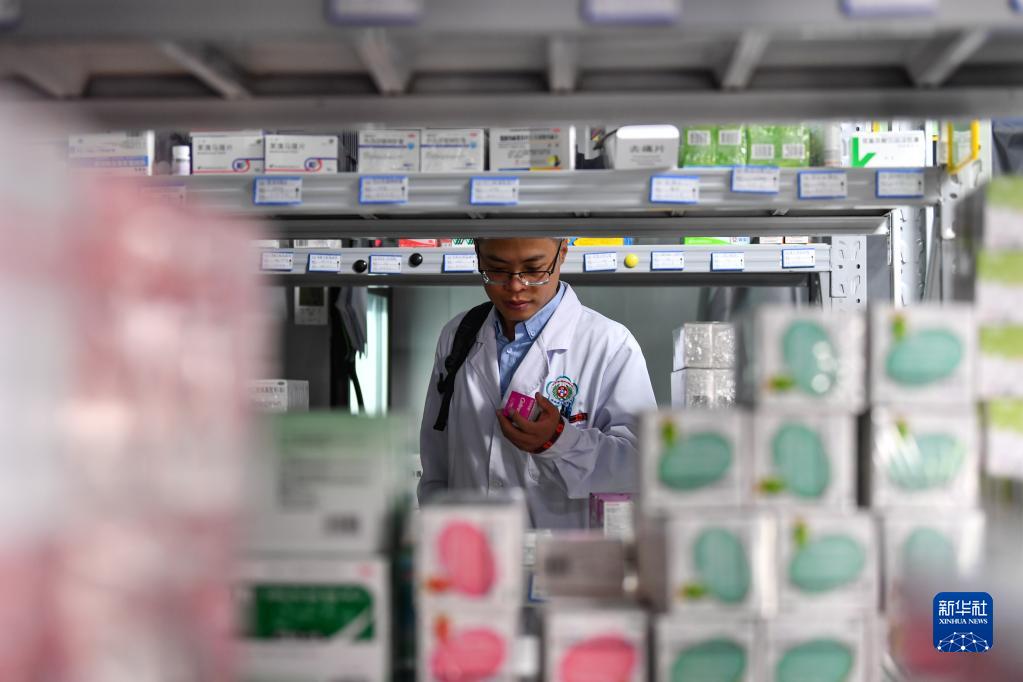 6月12日出發(fā)前,王振疆醫(yī)生在米林市人民醫(yī)院庫房領取藥品。新華社記者 晉美多吉 攝