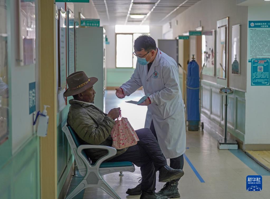 6月12日,王彤旭醫(yī)生在米林市人民醫(yī)院走廊里詢問患者病情恢復情況。新華社記者 邵澤東 攝