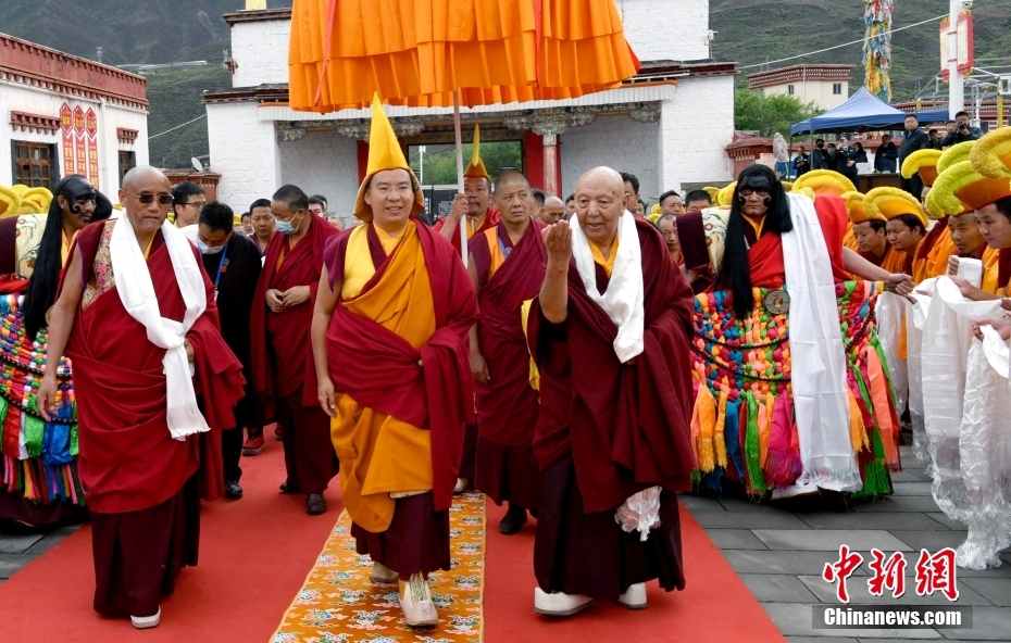 6月12日,全國政協(xié)常委、中國佛教協(xié)會副會長、中國佛協(xié)西藏分會會長班禪額爾德尼·確吉杰布在西藏昌都市強巴林寺禮佛講經,并為3.6萬余名信眾摸頂賜福。強巴林寺僧眾組成儀仗隊、焚香、吹響法號,高舉寶傘等,以藏傳佛教最高禮儀迎接班禪。強巴林寺為藏傳佛教格魯派創(chuàng)始人宗喀巴弟子向森·西繞桑布創(chuàng)建于15世紀,因寺內主供強巴(彌勒)佛而得名。圖為6月12日,班禪抵達西藏昌都市強巴林寺,僧眾組成儀仗隊、焚香、吹響法號,高舉寶傘等,以藏傳佛教最高禮儀迎接班禪。
