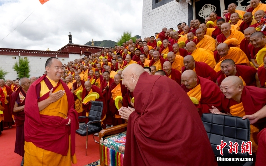 圖為6月12日,班禪與西藏昌都強巴林寺僧眾合影。