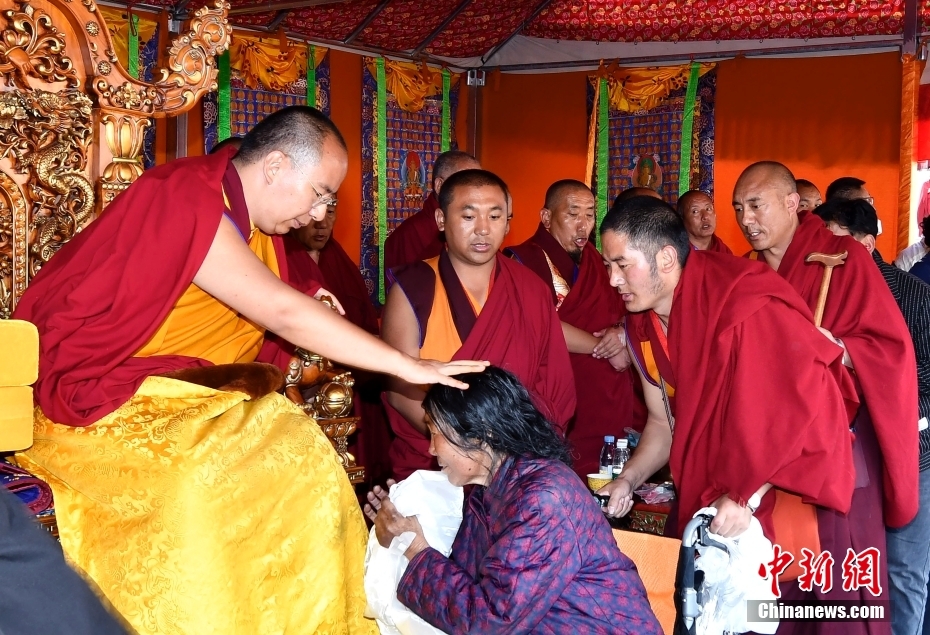 圖為6月12日,班禪在西藏昌都強巴林寺為信眾摸頂賜福。