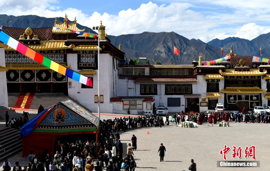 圖為6月12日,信眾在昌都強巴林寺排隊等待班禪摸頂賜福。
