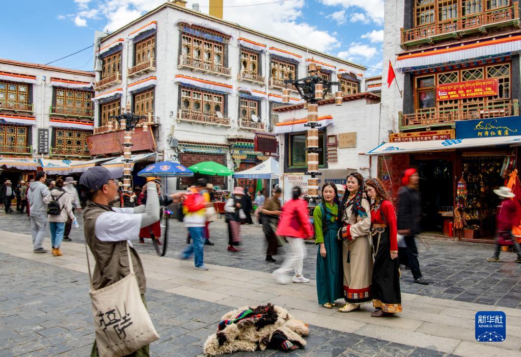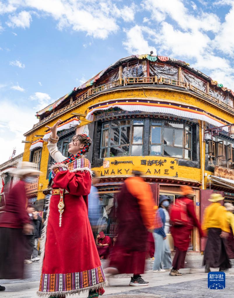 游客身著藏裝在八廓街拍照留念(6月13日攝)。新華社記者 姜帆 攝