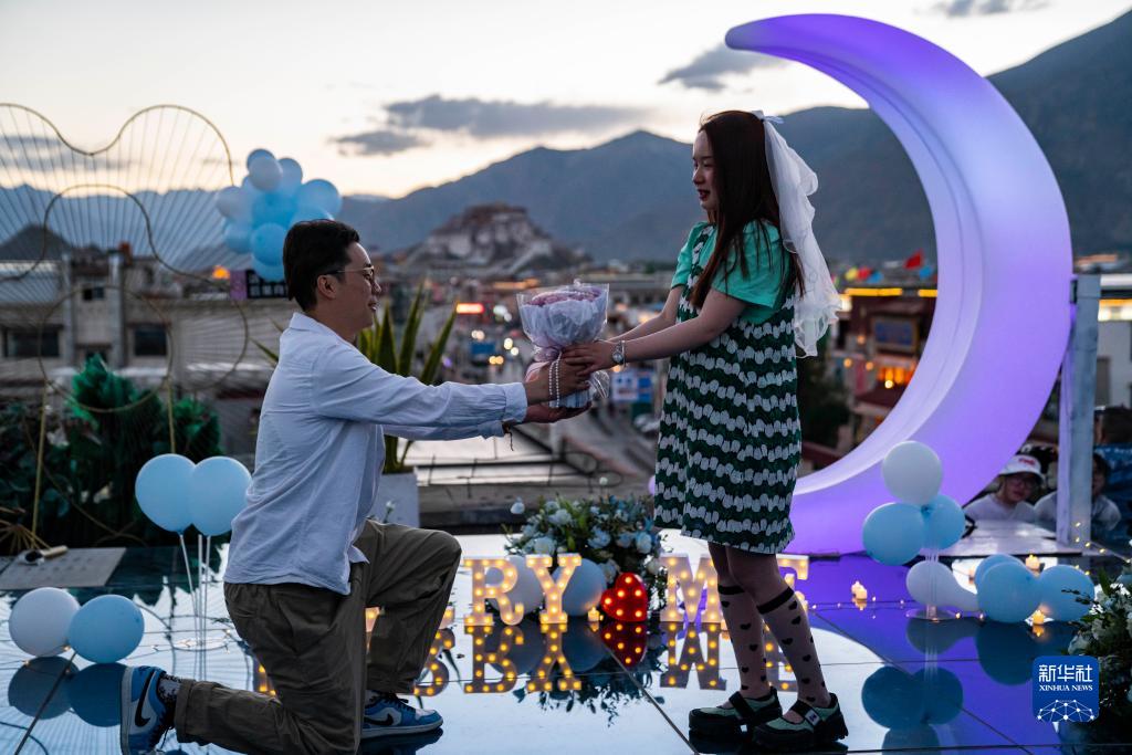 在八廓街附近的一家餐廳樓頂舉行的求婚儀式(6月7日攝)。新華社記者 孫非 攝