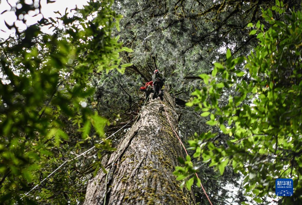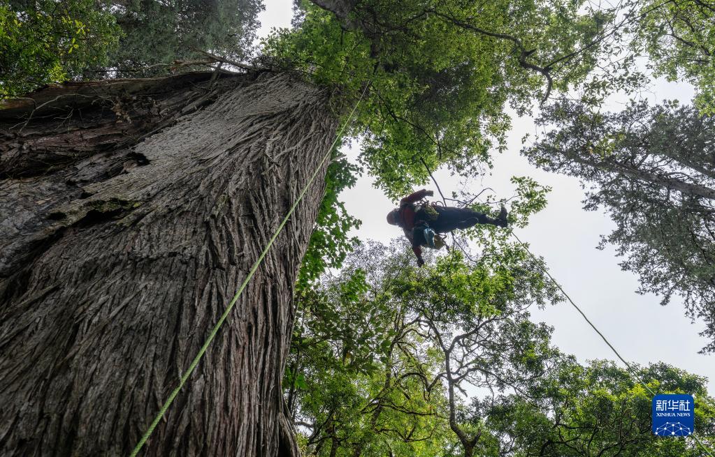 6月15日,國家重要野生植物種質資源庫辰山中心負責人鐘鑫(下)和助手在攀爬亞洲第一高樹附近的高樹,采集數(shù)據(jù)。新華社記者 晉美多吉 攝