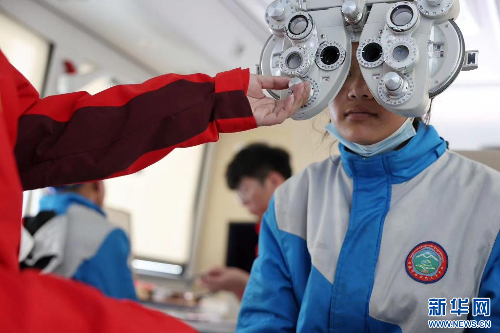 ??在西藏自治區(qū)那曲市色尼區(qū)第二中學(xué)(杭嘉中學(xué)),志愿者用綜合驗(yàn)光儀為學(xué)生驗(yàn)光(6月22日攝)。新華社發(fā)(趙穎碩 攝)