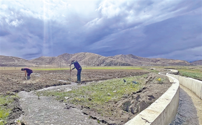 圖為浪卡子縣多卻鄉(xiāng)亞如村群眾正在從干渠引水灌溉農(nóng)田。記者 丹增平措 見習(xí)記者 武沛濤 攝