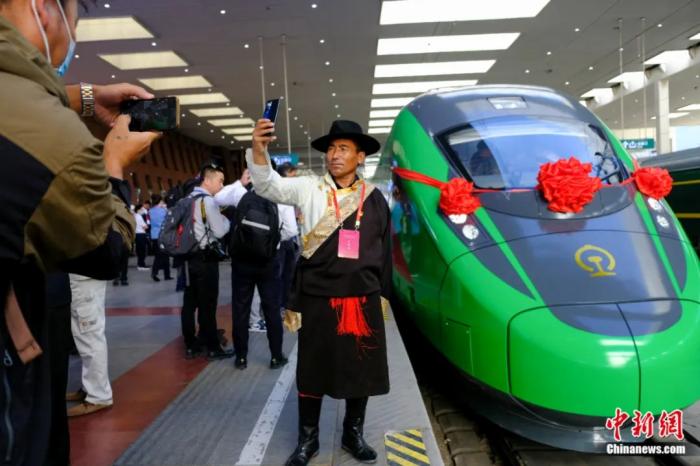 2021年6月25日,川藏鐵路拉林段(拉林鐵路)正式開通運(yùn)營。民眾在拉薩火車站復(fù)興號車頭前自拍留念。江飛波 攝