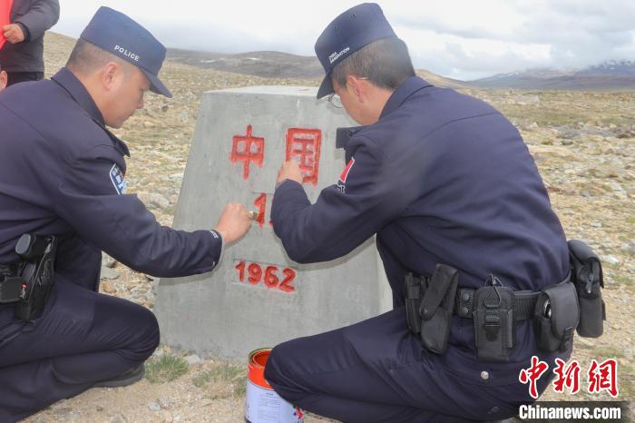 楊軍(左)和馬攸橋邊境檢查站同事在聯(lián)合踏查中為界碑描紅。馬攸橋邊境檢查站 供圖