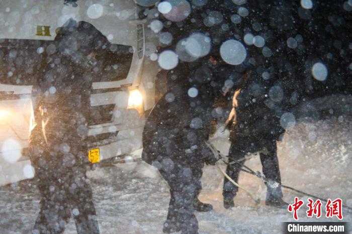 來到現(xiàn)場后楊軍發(fā)現(xiàn),該路段積雪超過半米深,車輛已經深陷其中無法行駛。楊軍立即組織民警用鐵鍬鏟雪、人力助推、繩索牽引等進行施救,經過一個多小時的努力,成功將部分被困車輛救出??涩F(xiàn)場風雪突然變大,下雪速度遠超過救援速度,轉眼間,路面積雪接近1米高,到深夜時,雙向車道上被困車輛、人員已達17輛、49人,看到情況越來越嚴峻,楊軍迅速對接、協(xié)調駐地交通部隊共同開展救援。