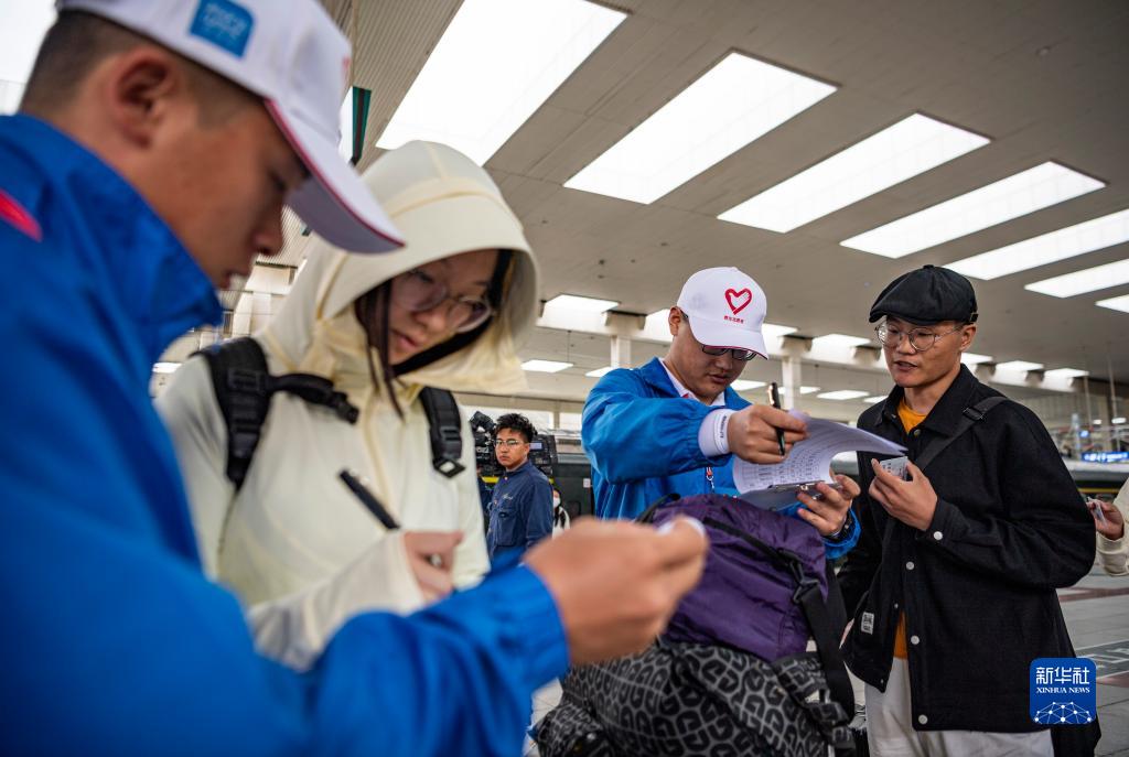 7月24日,在拉薩火車站,工作人員為抵達(dá)拉薩的志愿者登記信息。新華社記者 孫非 攝