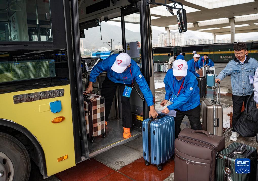 7月24日,在拉薩火車站,工作人員幫剛剛抵達(dá)拉薩的志愿者搬運(yùn)行李。新華社記者 孫非 攝