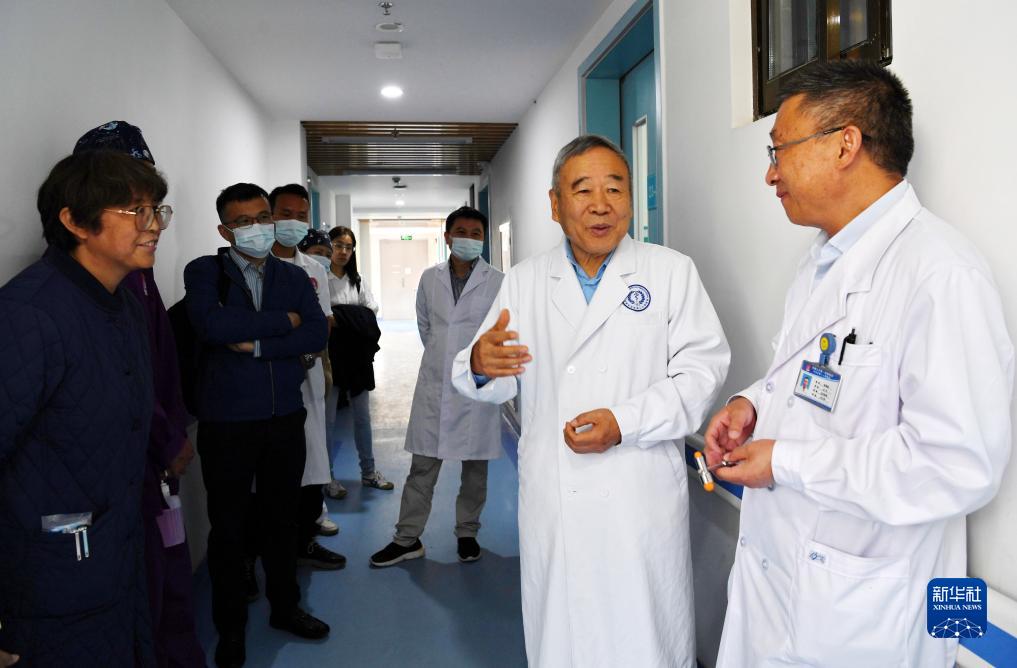 8月10日,中國科學院院士、首都醫(yī)科大學附屬北京天壇醫(yī)院神經外科學中心主任醫(yī)師趙繼宗(右二)和西藏第二人民醫(yī)院的醫(yī)生在醫(yī)院病房走廊里交流。新華社記者 張汝鋒 攝