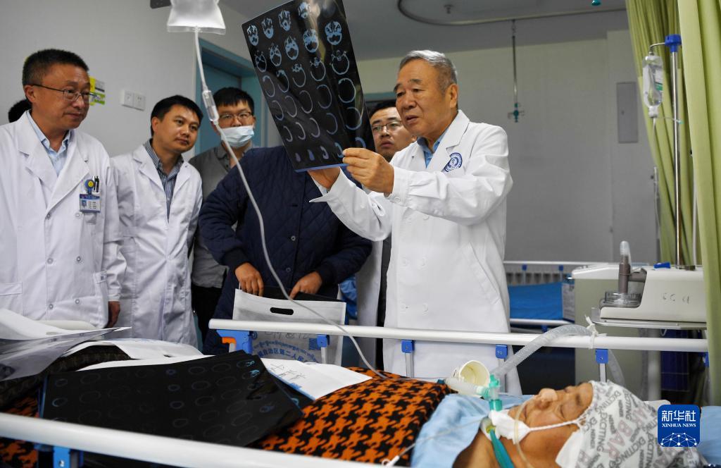 8月10日,中國科學院院士、首都醫(yī)科大學附屬北京天壇醫(yī)院神經外科學中心主任醫(yī)師趙繼宗(左三)和北京天壇醫(yī)院神經外科學中心主任醫(yī)師仇漢誠(左二)進行教學查房。新華社記者 張汝鋒 攝