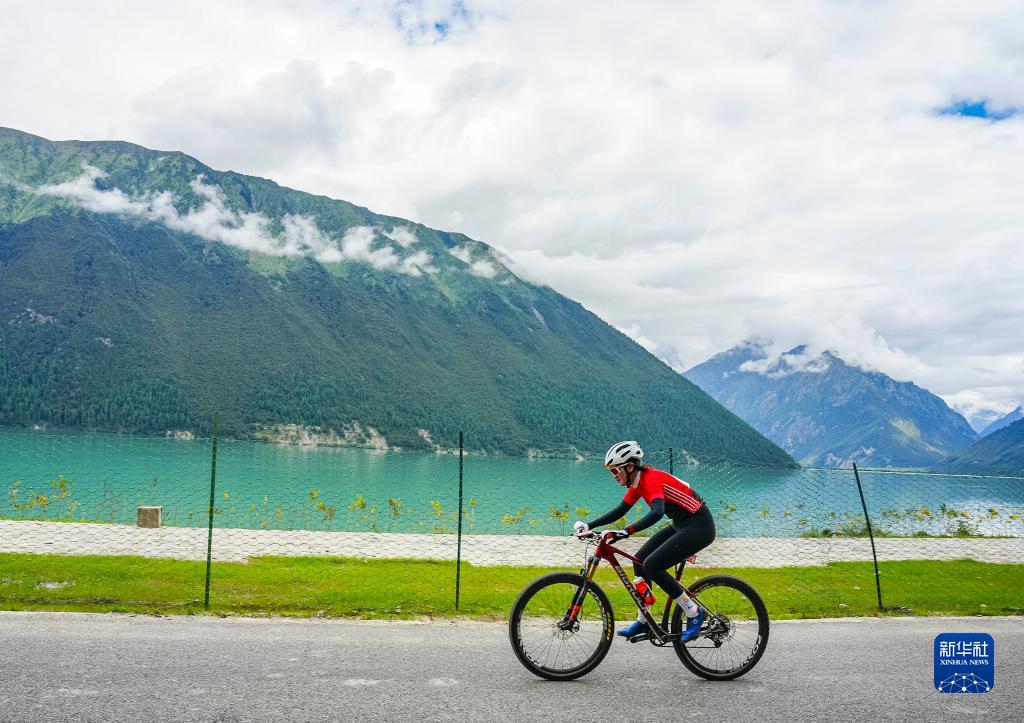 9月9日,老隊員車隊選手白瑪央吉在比賽中經過巴松措湖區(qū)。新華社發(fā)(劉劍璞 攝)