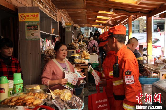 圖為消防員正在為景區(qū)商戶普及防火知識。西繞拉翁 攝