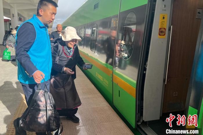 圖為西藏日喀則站工作人員攙扶老人乘車高原復(fù)興號(hào)。日喀則站 供圖