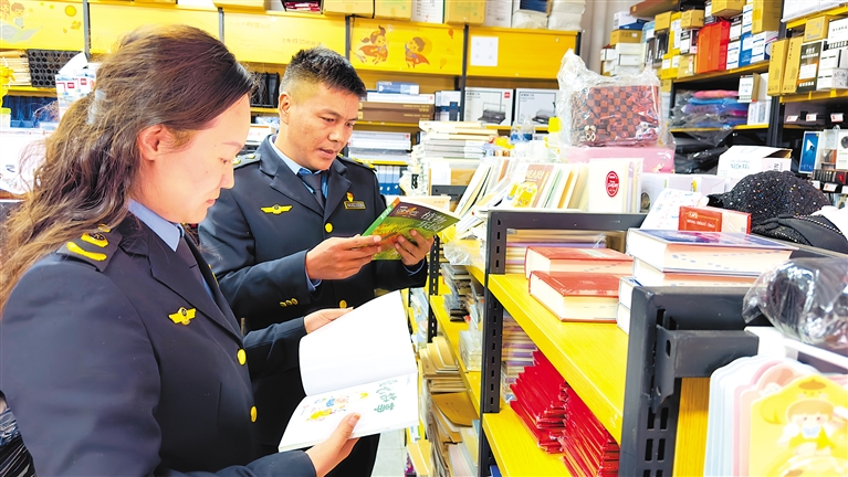 圖為山南市瓊結(jié)縣市場(chǎng)監(jiān)督管理局執(zhí)法人員在某書店檢查。記者 白瑪澤旺 通訊員 倫珠澤仁 攝