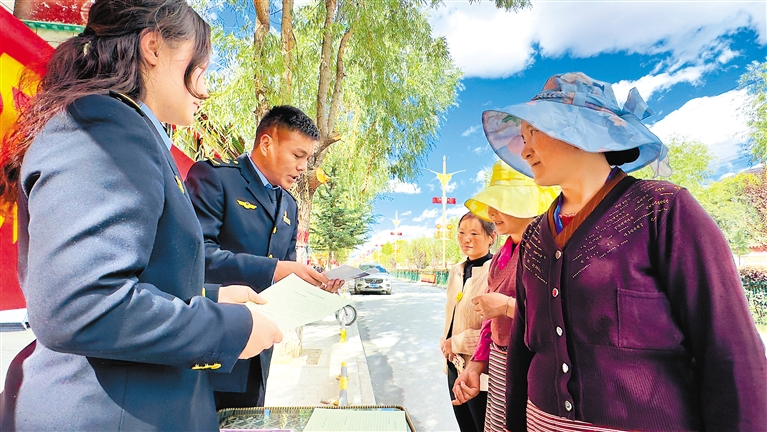 圖為山南市瓊結(jié)縣市場(chǎng)監(jiān)督管理局執(zhí)法人員向群眾發(fā)放知識(shí)產(chǎn)權(quán)相關(guān)宣傳冊(cè)。記者 白瑪澤旺 通訊員 倫珠澤仁 攝