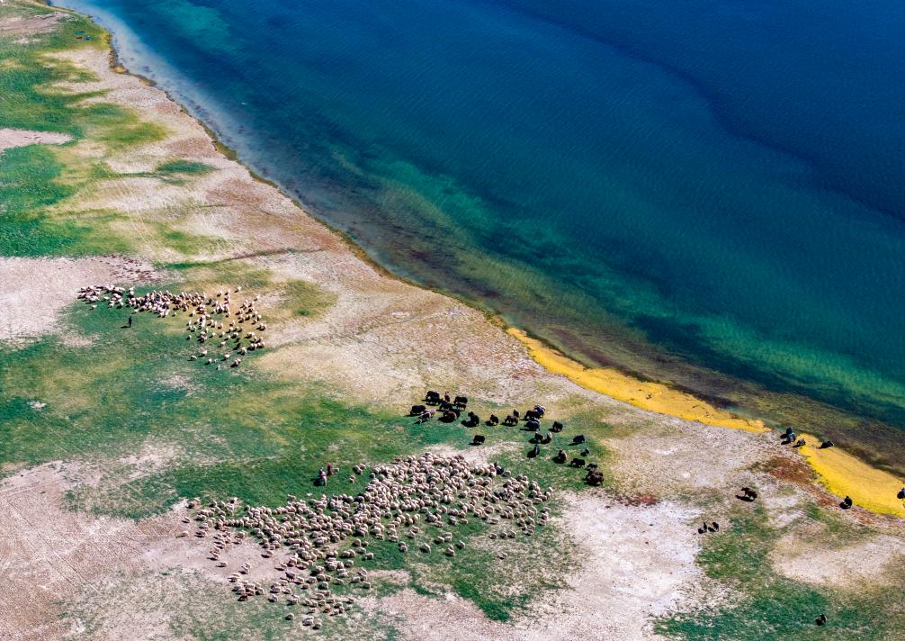 牧民在阿里地區(qū)日土縣班公湖畔放牧白絨山羊和牦牛(無人機(jī)照片,9月21日攝)。新華社記者 姜帆 攝