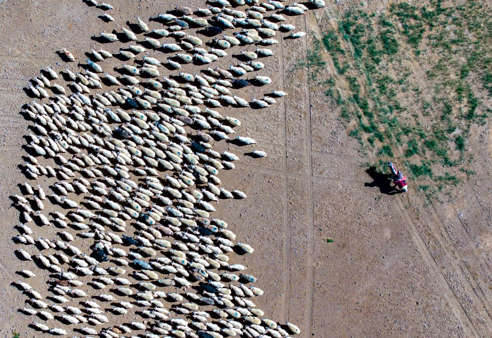 牧民在阿里地區(qū)日土縣班公湖畔放牧白絨山羊(無人機(jī)照片,9月21日攝)。新華社記者 姜帆 攝