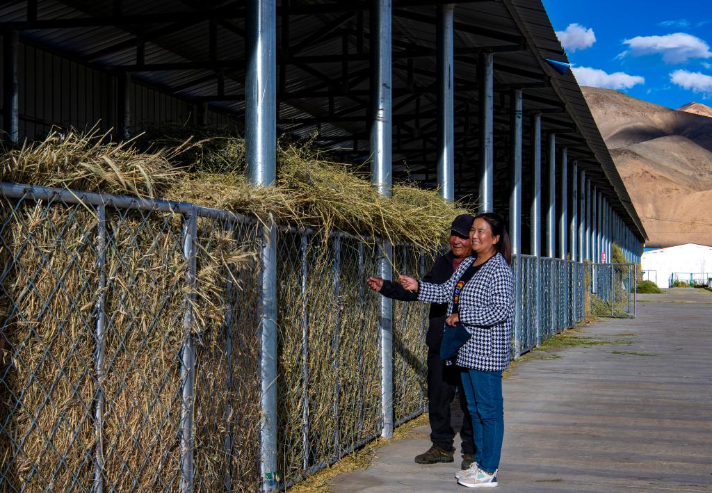 阿里地區(qū)噶爾縣昆莎鄉(xiāng)噶爾新村村民白瑪努桑(左)與地區(qū)農(nóng)業(yè)農(nóng)村局草業(yè)工作站工作人員巴桑多吉在查看草棚里晾曬好的紫花苜蓿(9月20日攝)。新華社記者 姜帆 攝