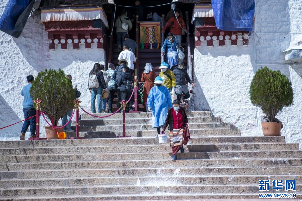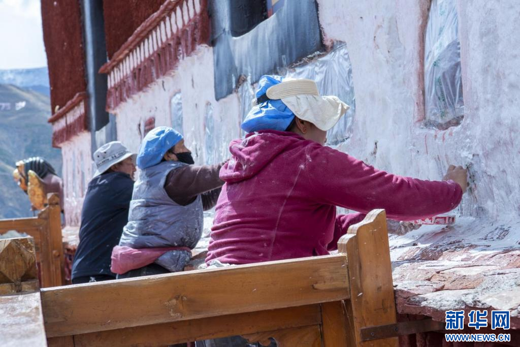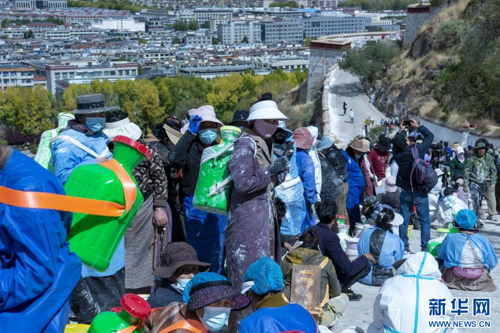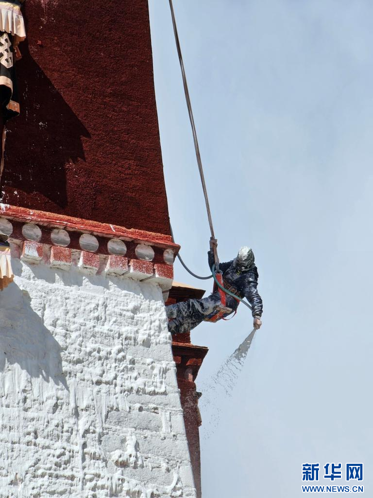 10月18日,布達(dá)拉宮“美容師”們在噴灑外墻。新華網(wǎng) 旦增努布 攝