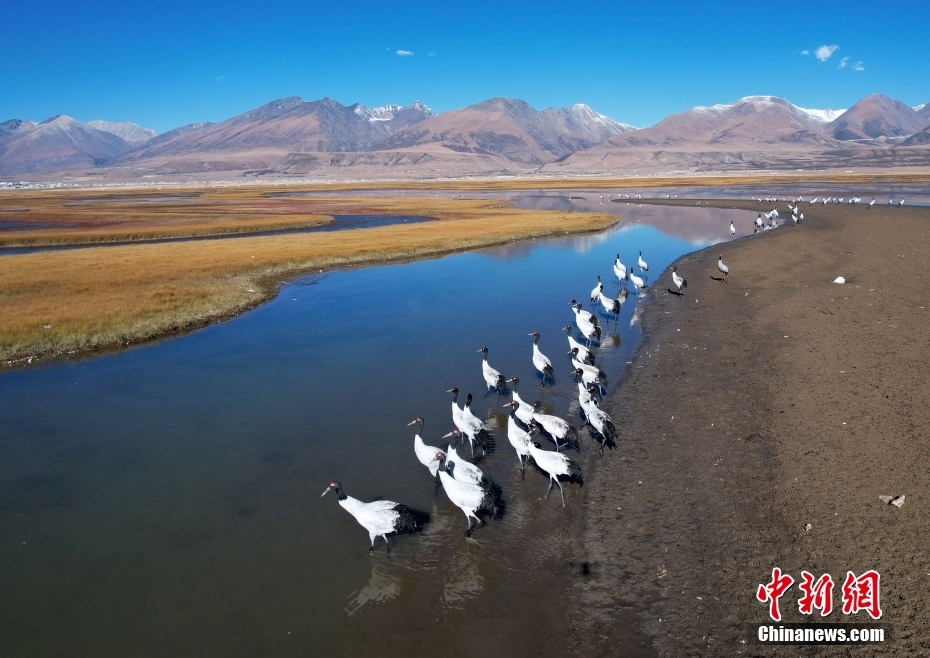 10月23日,成群的黑頸鶴在拉薩市當(dāng)雄縣阿熱濕地內(nèi)覓食。黑頸鶴是全球十五種鶴類中,唯一在高原地區(qū)繁殖和越冬的鶴類,屬中國國家一級保護野生動物。(無人機照片)