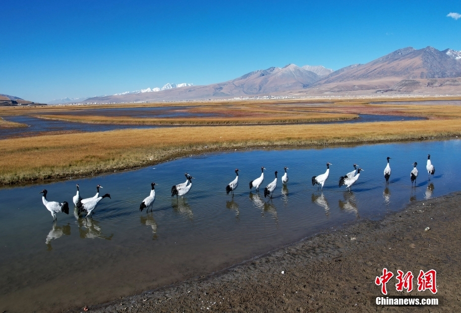 10月23日,成群的黑頸鶴在拉薩市當(dāng)雄縣阿熱濕地內(nèi)覓食。黑頸鶴是全球十五種鶴類中,唯一在高原地區(qū)繁殖和越冬的鶴類,屬中國國家一級保護野生動物。