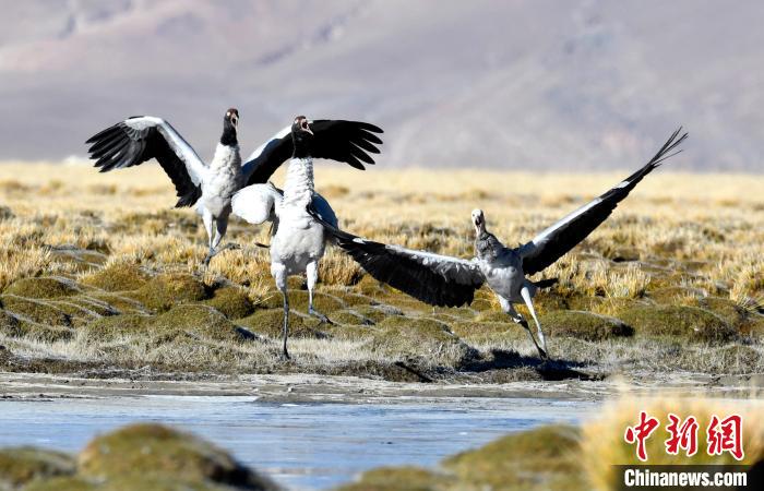 10月21日,黑頸鶴在西藏那曲市申扎縣買(mǎi)巴鄉(xiāng)附近的濕地“翩翩起舞”?!±盍?攝