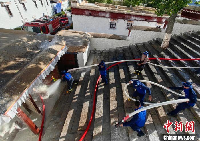 冬季來臨天氣干燥,為杜絕墻體粉刷過程中因意外引燃山體雜草,造成不可挽回的損失,在墻體粉刷正式開始前一周,大隊(duì)每日清晨、傍晚組織指戰(zhàn)員對布達(dá)拉宮山體進(jìn)行全面濕化,消除火災(zāi)隱患,濕化累計(jì)用水200余噸。