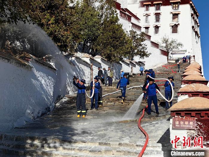 布達(dá)拉宮墻體粉刷正式開始前一周,大隊(duì)每日清晨、傍晚組織指戰(zhàn)員對布達(dá)拉宮山體進(jìn)行全面濕化,消除火災(zāi)隱患。劉瑜 攝
