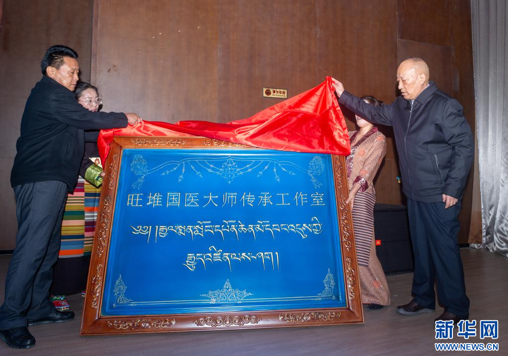 10月26日,西藏藏醫(yī)藥大學(xué)黨委副書記、校長(zhǎng)米瑪(左一)和國(guó)醫(yī)大師旺堆(右一)共同揭牌國(guó)醫(yī)大師傳承工作室。新華社記者 旦增尼瑪曲珠 攝