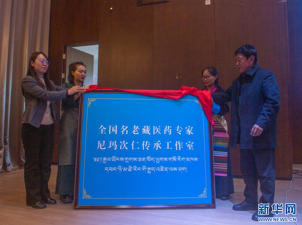10月26日,西藏自治區(qū)藏醫(yī)藥管理局副局長(zhǎng)王曉燕(左一)和岐黃學(xué)者、全國(guó)名老中醫(yī)藥專家尼瑪次仁(右一)共同揭牌傳承工作室。新華社記者 旦增尼瑪曲珠 攝